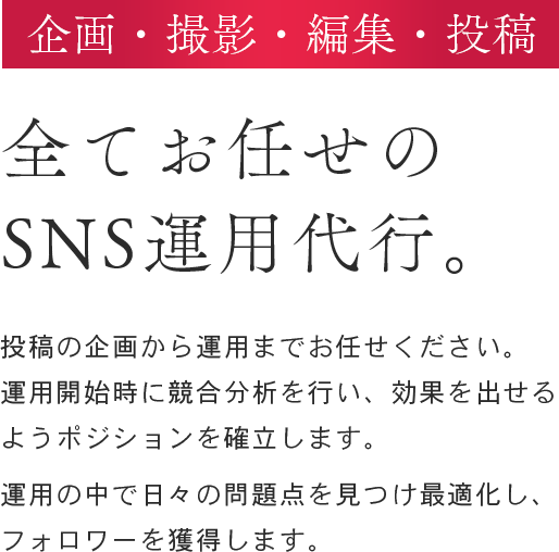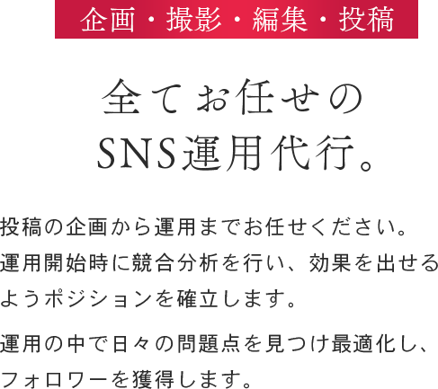 はい、既存のアカウントを運用代行することも可能です。ただし、過去の運用状況によっては、アルゴリズムの影響で伸びにくい場合もございます。その際は、診断の上で新規アカウントの開設をご提案させていただくこともあります。最適な方法をアドバイスいたします。